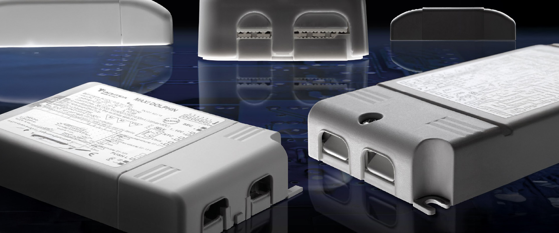 Serie completa di Alimentatori elettronici marini, suddivisa in: Alimentatori Marini a corrente costante / Alimentatori Marini a corrente e tensione costante / Alimentatori Marini dimmerabili Multicorrente/multitensione regolabili con 1-10V, PUSH, DMX, DALI, etc…